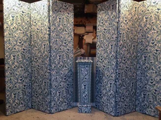 tenture murale en drap de laine bleu avec application de galons